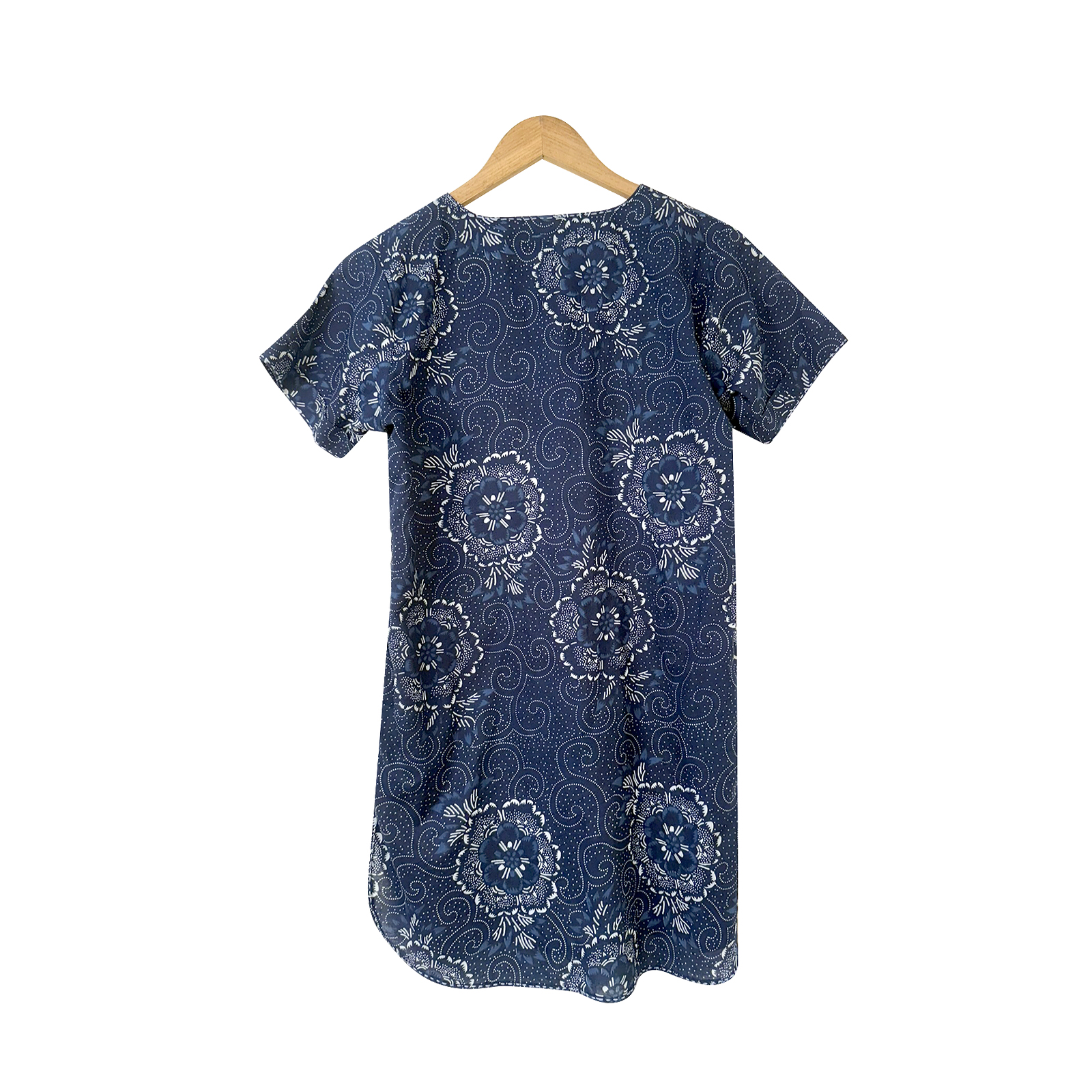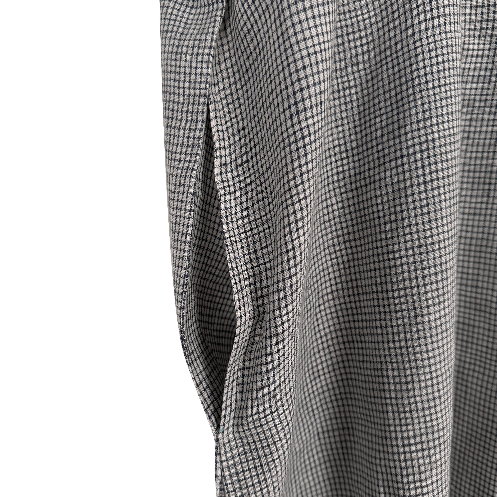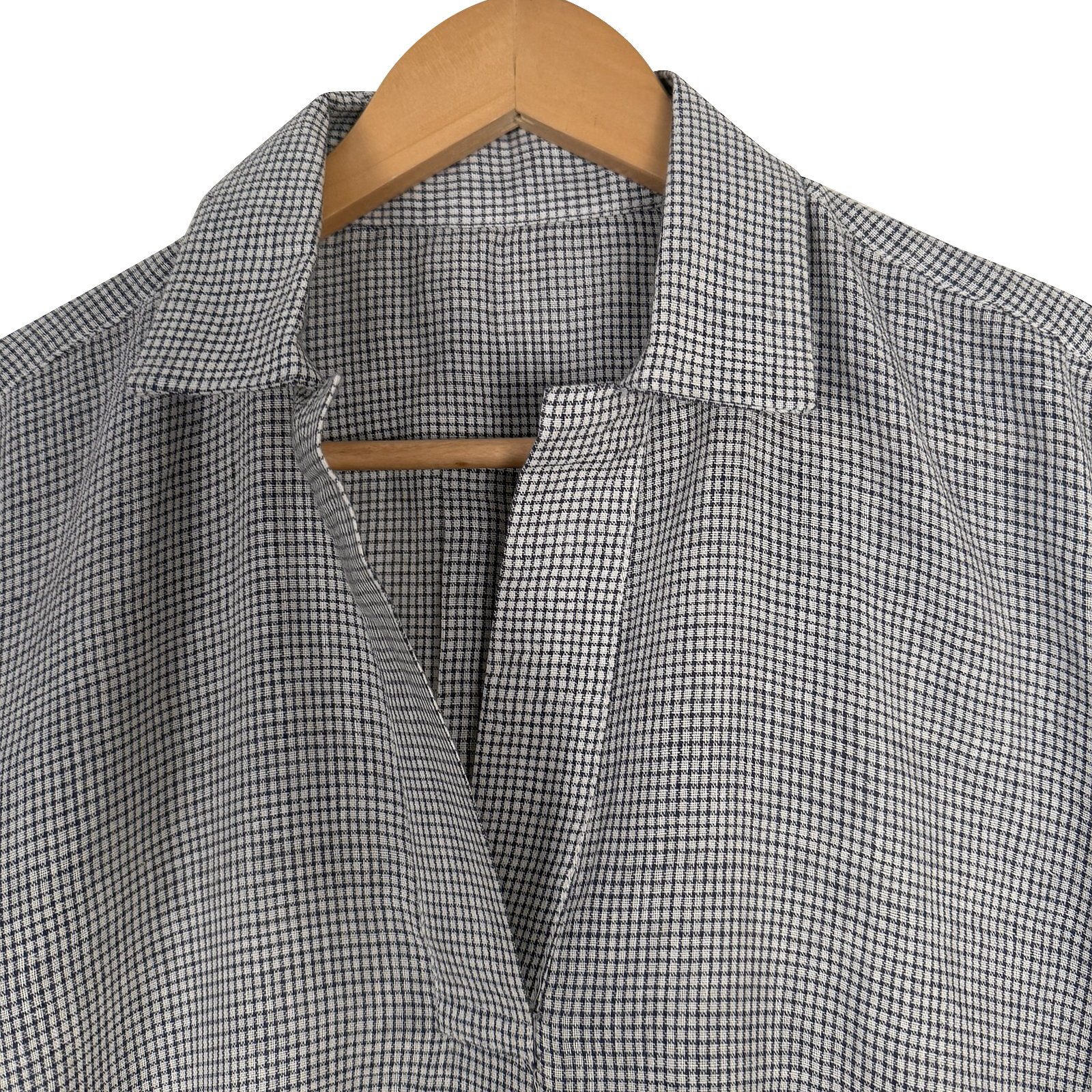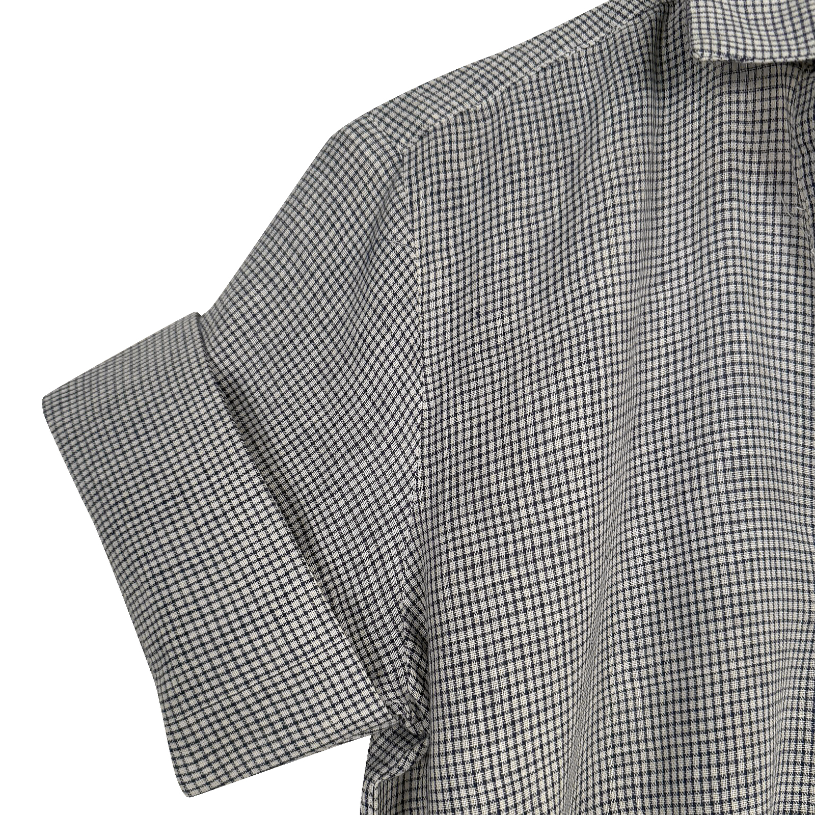Design: Monochrome woven pattern, button-down style, short sleeves, high-low hemline