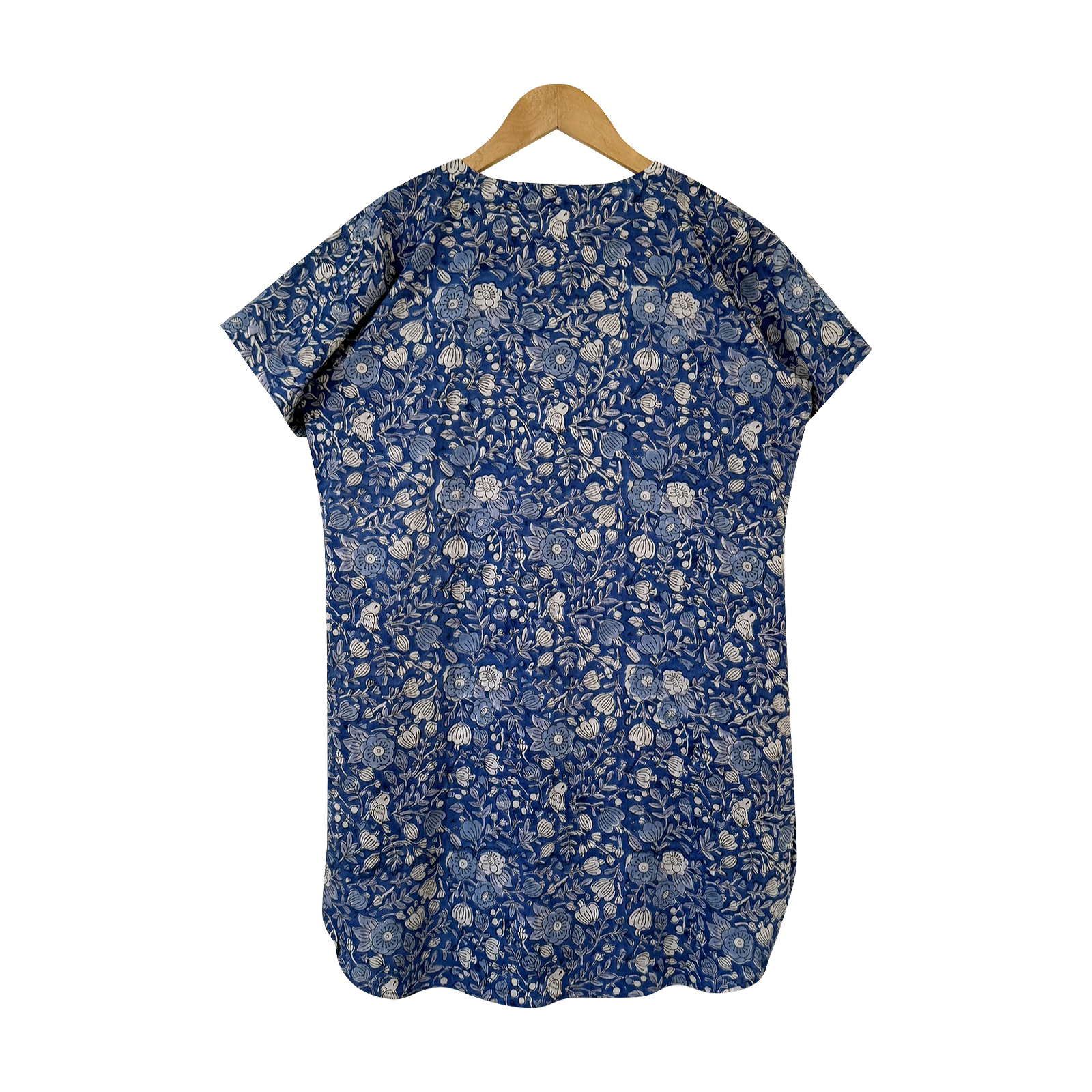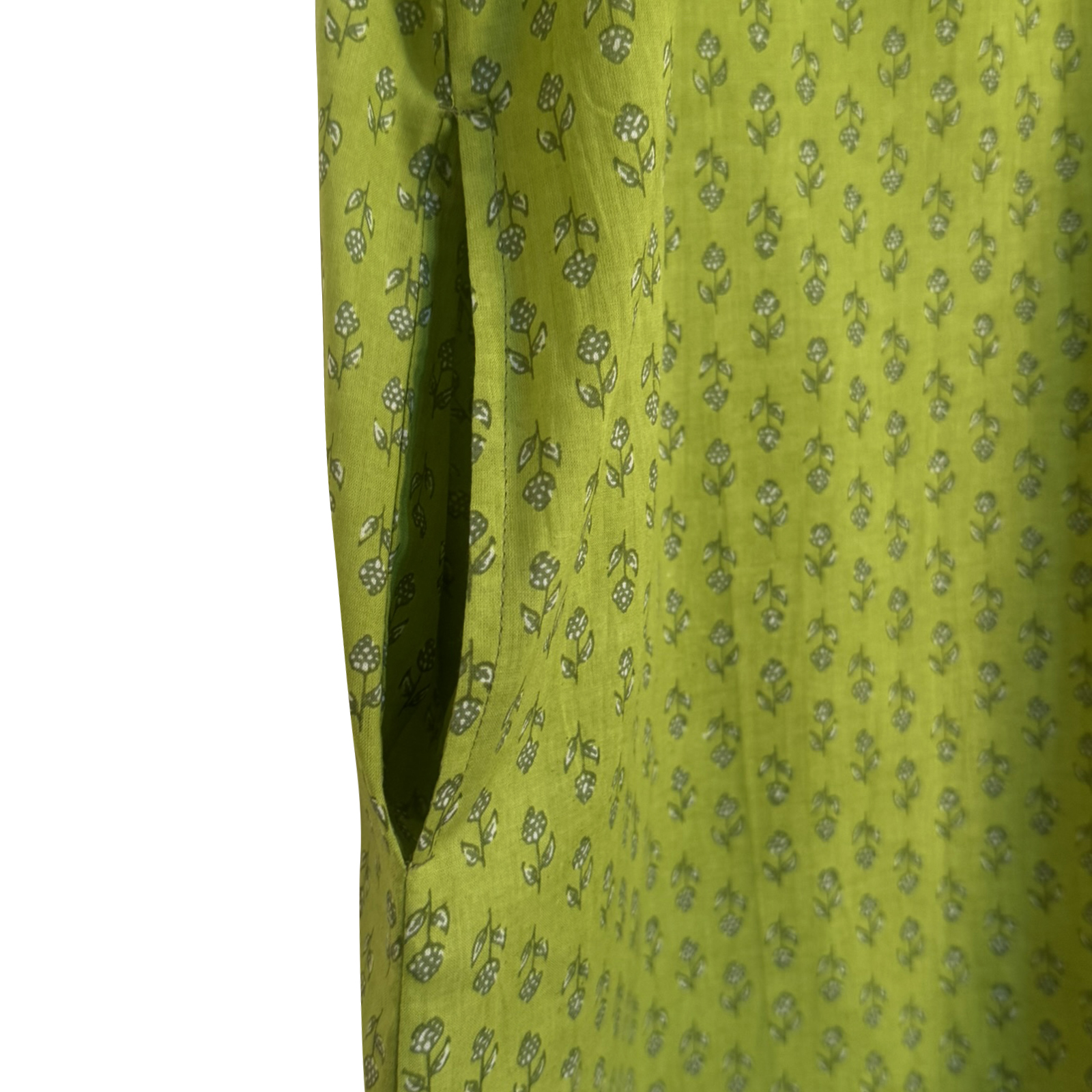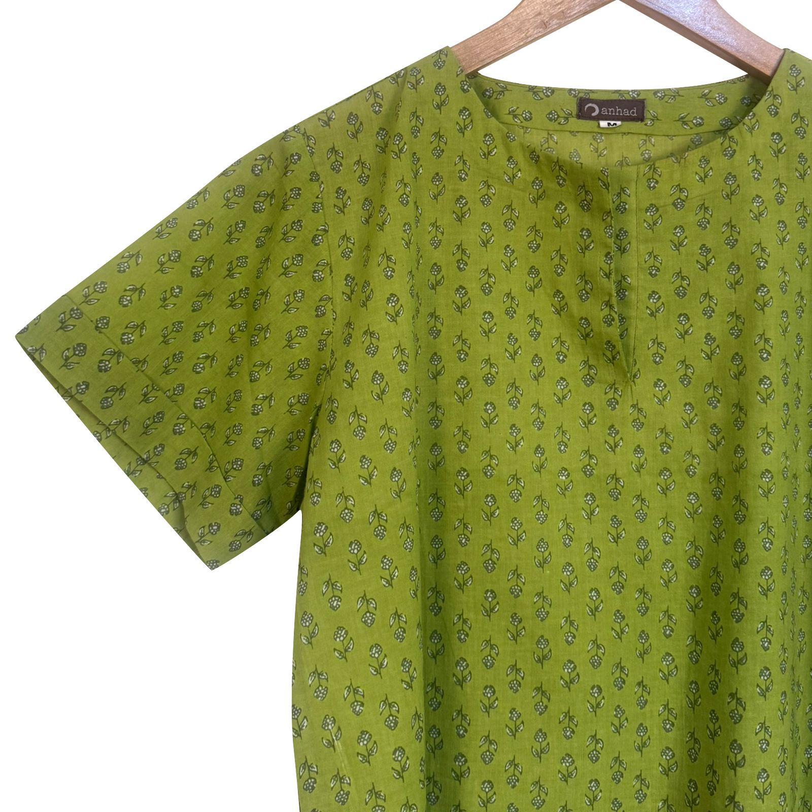 Refresh your look with this elegant light green hand block print cotton kurti, crafted from 100% cotton fabric and adorned with beautiful hand embroidery. This kurti features an all-over miniature botanical block print, inspired by Bagru print motifs from Rajasthan, which are renowned for their fine details and vibrant style.