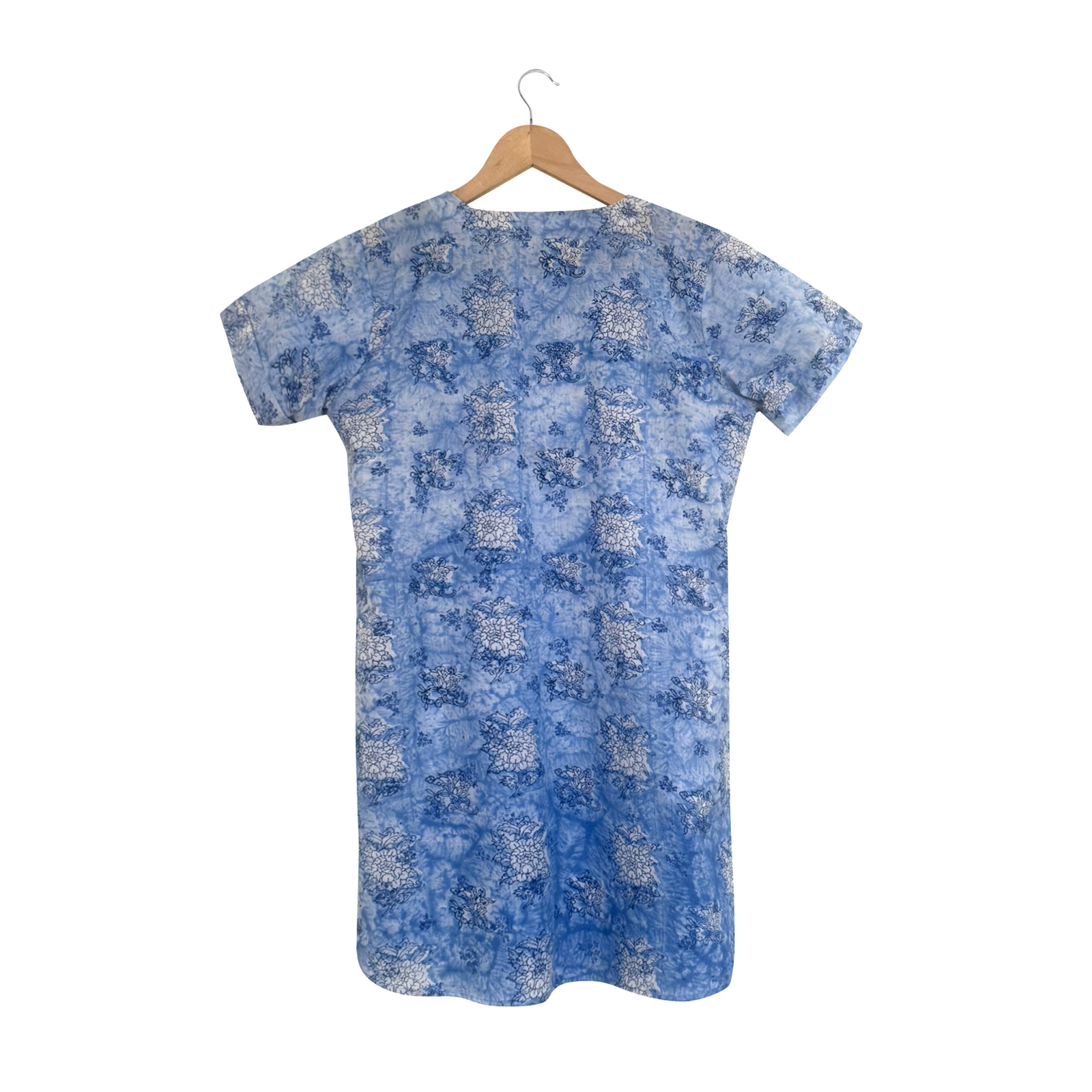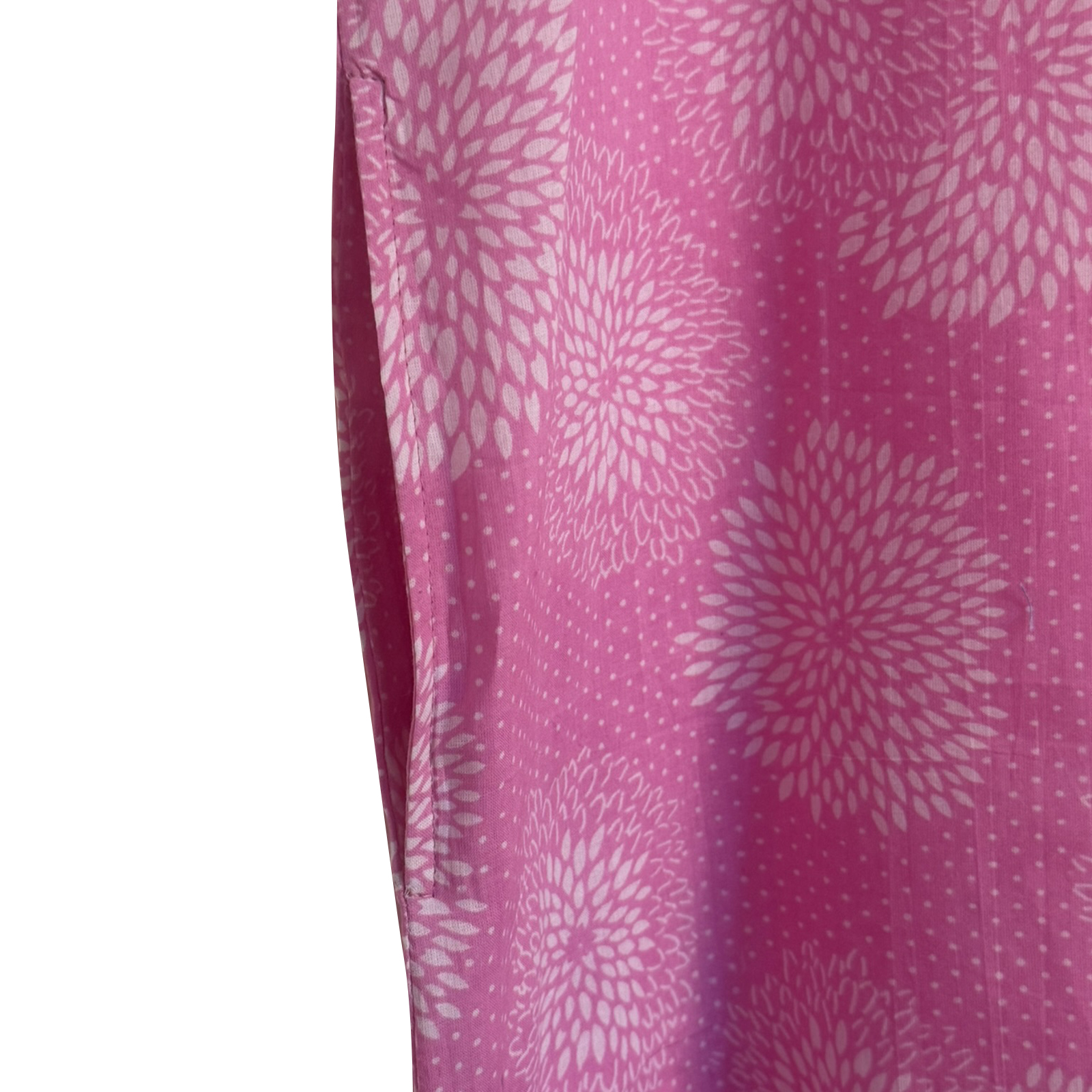 This dress combines unmatched comfort, breathability, and artisanal beauty with the finesse of hand-crafted embroidery that makes each piece truly unique. The vibrant pink base, embellished with delicate white floral prints, creates a refreshing and elegant look suitable for both casual and festive occasions. The rounded motifs and simple straight silhouette highlight the timeless charm of traditional Indian design, while the hand embroidery enhances its exclusive appeal.